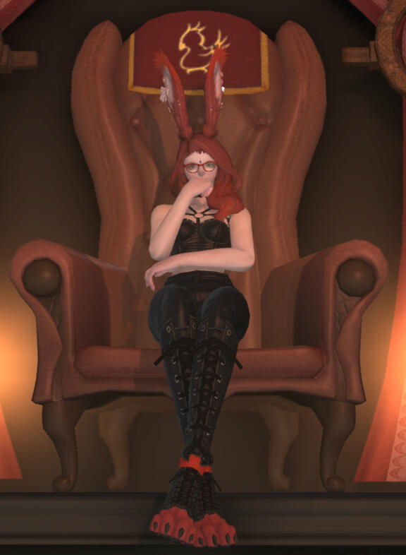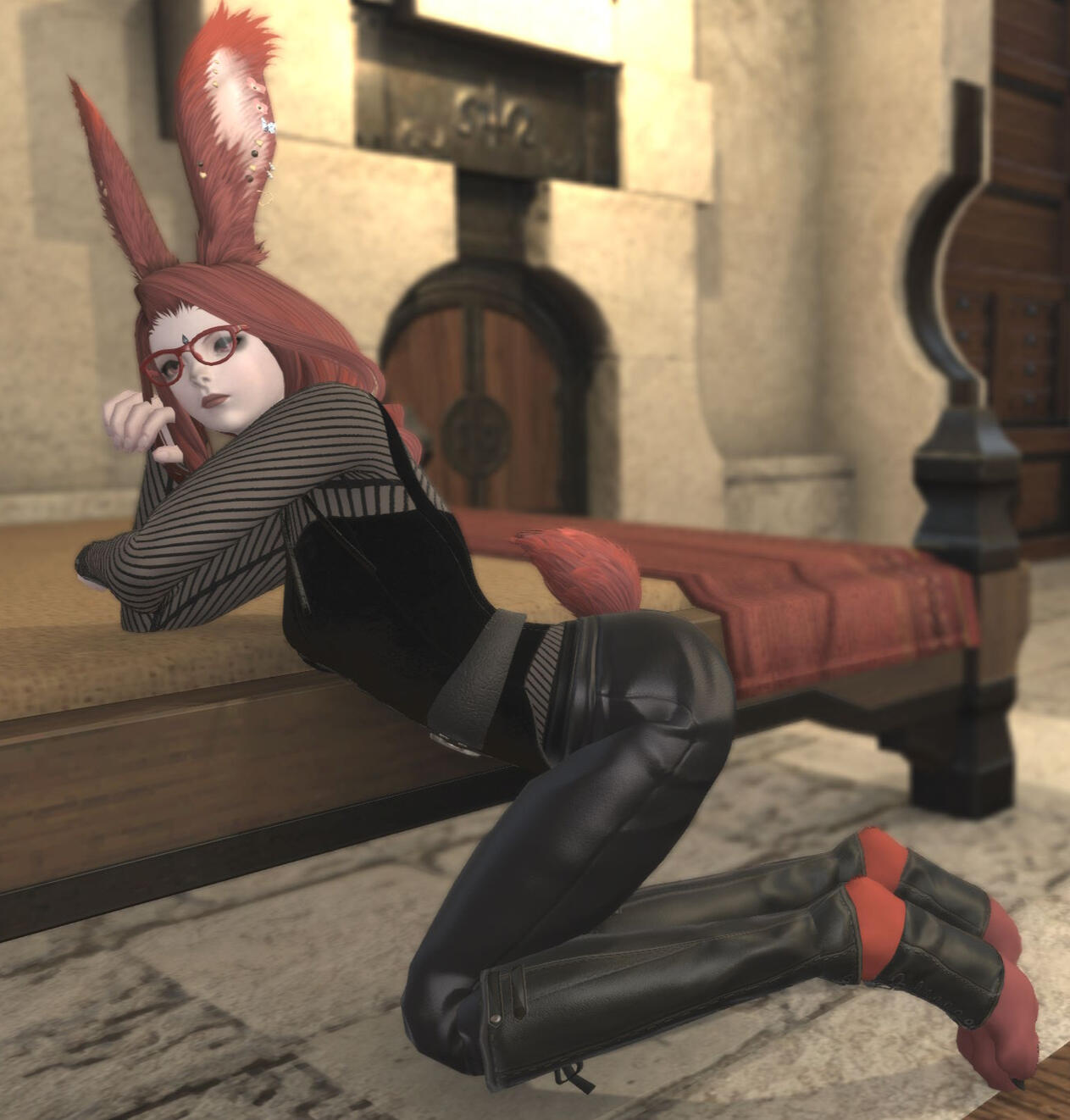 I'm a bunny from the realm of Tyria, I got caught up in the events of the Wizards Tower, a disruption in the magical flows, and a thinning of the barriers between the different realms.In Tyria My primary job was that of a crafter of crafter of leather goods, especially "Specialty Goods." You will often see examples of my work around my own neck or wrists.As a result of the thinning of the barriers between realms, in Tyria, I was randomly teleported to Eorzea. After the sudden shift, I attempted to take up my leatherworking again in Eorzea.However I found that Leather was harder to come by in Eorzia and so I was forced to don my sword and shield to gather the materials for my leatherworking. I slowly but surely learned the skills of a paladin.I've also got a bit of a gambling problem. Almost as soon as I arrived in Eorzea I discovered the Gold Saucer casino. It wasn't long after, that I managed to accrue an extreme amount of debt to the Gold Saucer. Now I'm looking for ways to pay off that debt.